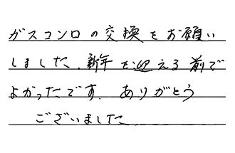 ガスコンロの交換をお願いしました。新年を迎える前でよかったです。ありがとうございました。