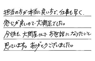 他社は写真を送って、メールのみの見積りでしたが、御社は迅速に現地見積りをしていただけたので、安心して依頼できました。ネットで評価が高かったのも納得です。