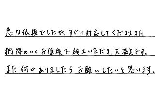 急な依頼でしたが、すぐに対応してくださり、また、納得のいくお値段で施工いただき、大満足です。また何かありましたら、お願いしたいと思います。