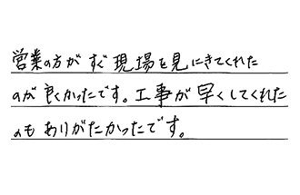 営業の方がすぐ現場を見にきてくれたのが良かったです。工事が早くしてくれたのもありがたかったです。
