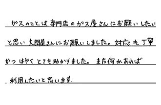 ガスのことは専門店のガス屋さんにお願いしたいと思い、大問屋さんにお願いしました。対応も丁寧かつはやく、とても助かりました。また何かあれば、利用したいと思います。