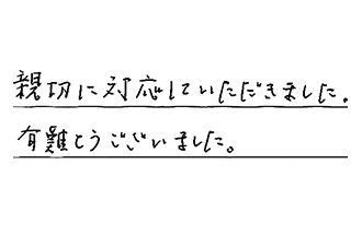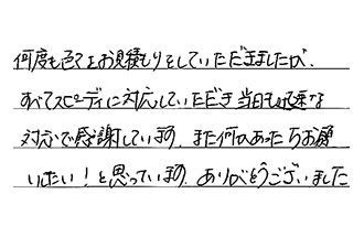 何度も色々とお見積もりをしていただきましたが、すべてスピーディに対応していただき、当日も迅速な対応で、感謝しています。また何かあったら、お願いしたい!と思っています。ありがとうございました。