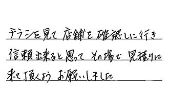 チラシを見て、店舗を確認しに行き、信頼出来ると思って、その場で見積りに来て頂くよう、お願いしました。