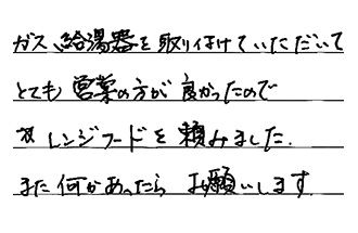 ガス給湯器を取り付けていただいて、とても営業の方が良かったので、レンジフードを頼みました。また何かあったら、お願いします。