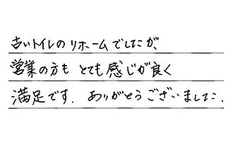 給湯器・水道蛇口、そして今回、トイレの交換でお世話になりました。対応が親切・丁寧で、ありがたく感じております。これからも何かの際には、お願いしたいと思います。