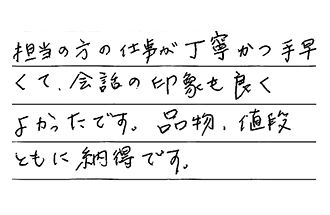 担当の方の仕事が丁寧かつ手早くて、会話の印象も良く、よかったです。品物・値段ともに納得です。