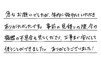 急なお願いでしたが、年内に施工していただき、ありがたかったです。事前の見積りの際、今の機器の不具合も見てくださり、工事まで安心して使うことができました。ありがとうございました!