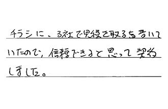 チラシに、3社で見積を取る旨書いていたので、信頼できると思って契約しました。