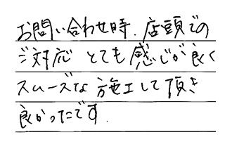 お問い合わせ時、店頭でのご対応、とても感じが良く、スムーズな施工して頂き、良かったです。