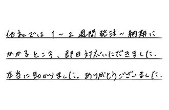 他社では1~2週間、発注~納期にかかるところ、即日対応いただきました。本当に助かりました。ありがとうございました。