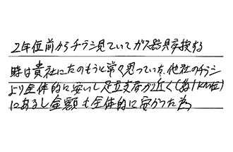 2年位前から、チラシ見ていて、ガス器具交換する時は、貴社にたのもうと常々思っていた。他社のチラシより全体的に安いし、足立支店が近く(約1km位)にあるし、金額も全体的に安かった為。