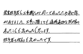 営業担当者と工事職人が同一であったため、安心感がありました。工事に際しても、適時適切な説明があったことも良かったと思います。担当者の対応も良かったです。